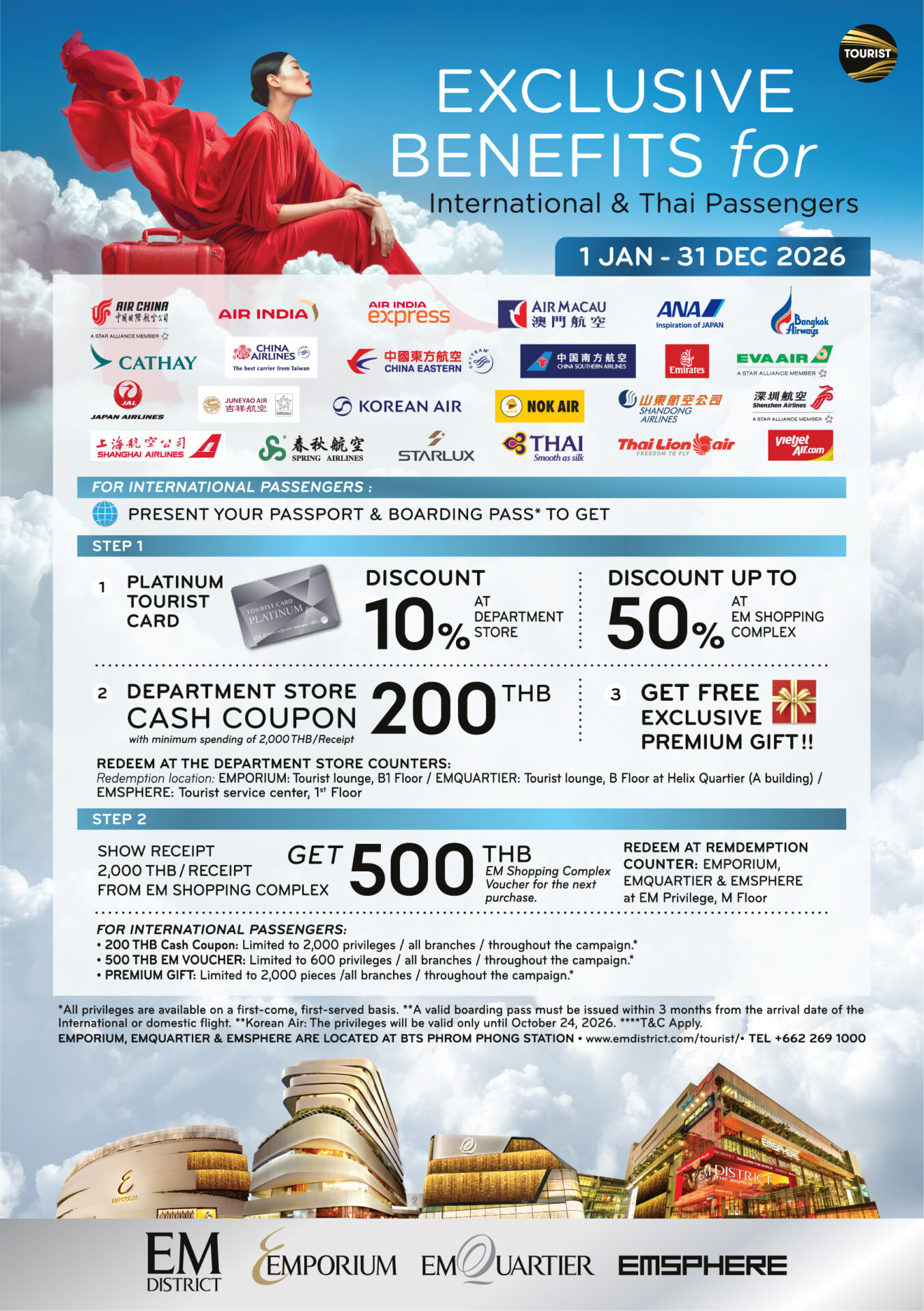 3. Spend THB 1,000 at Emporium, EmQuartier and EmSphere, then show receipt, passport and coupon to get shopping complex cash voucher THB 100 for your next purchase.